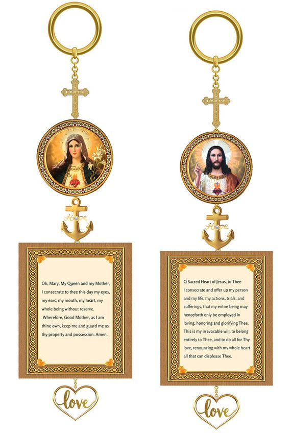 Elegant 2-sided Home Blessing Icon Charm featuring the Immaculate Heart of Mary on one side and the Sacred Heart of Jesus on the reverse. These beloved devotional images represent divine love, mercy, compassion, and protection.