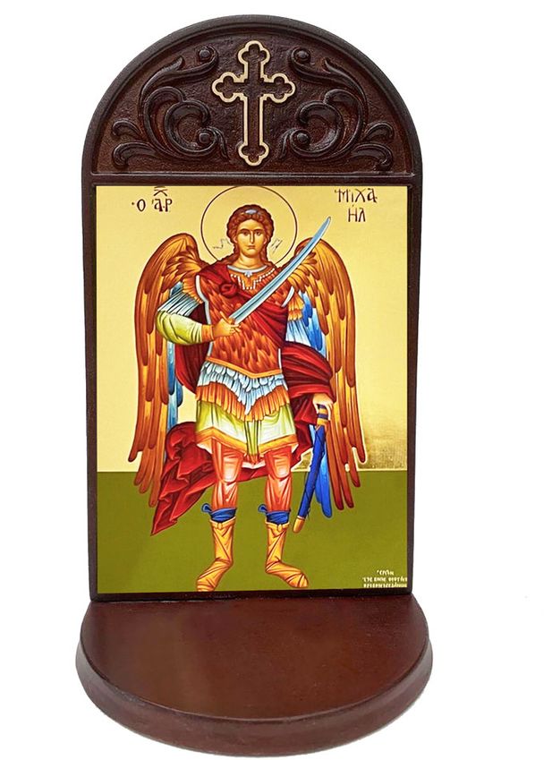 icon in wooden prayer shrine with 3" deep shelf to place rosary, candle etc.