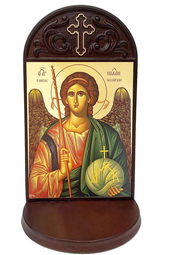 icon in wooden prayer shrine with 3" deep shelf to place rosary, candle etc.