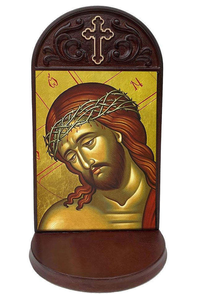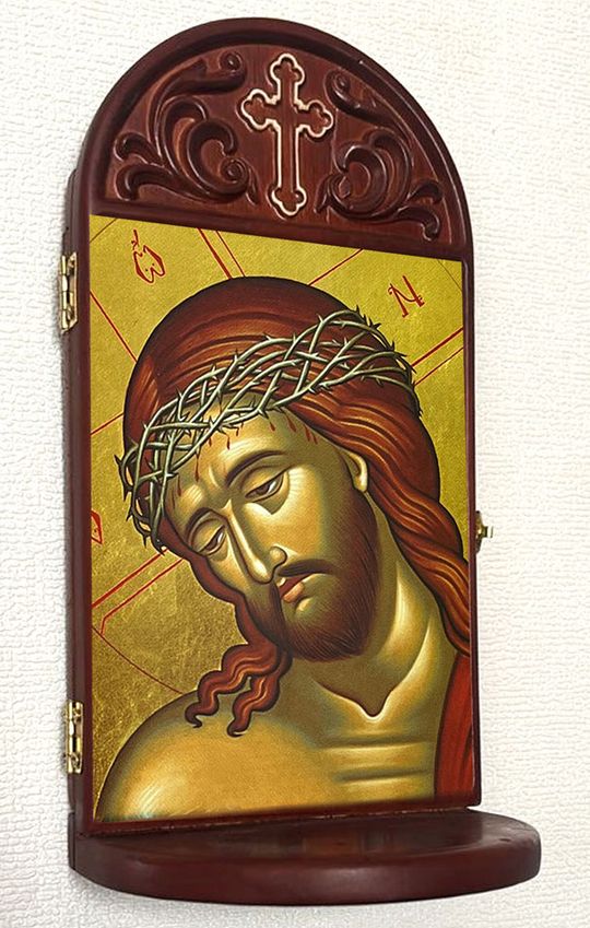 icon in wooden prayer shrine with 3" deep shelf to place rosary, candle etc.