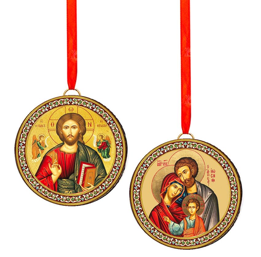 Christ the Teacher and The Holy Family, 2 sided round wooden icon pendant on red ribbon.