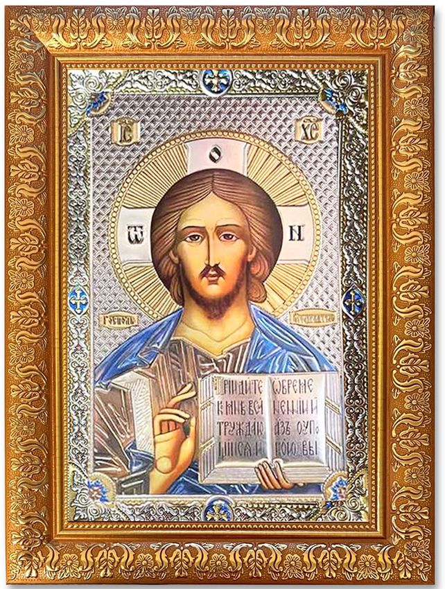 Christ TheTeacher, framed gold and silver foiled Orthodox icon covered with glass.