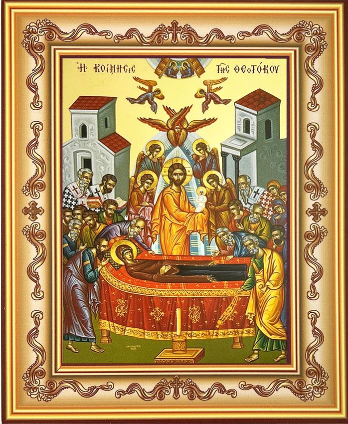 The Dormition of the Theotokos (Greek: Koimisis Tis Theotokou) is a major icon and feast day in Eastern Orthodox and Eastern Catholic traditions, celebrated on August 15 (or Aug 28 in some calendars). It depicts the Virgin Mary's "falling asleep" (death) and her subsequent bodily assumption into heaven