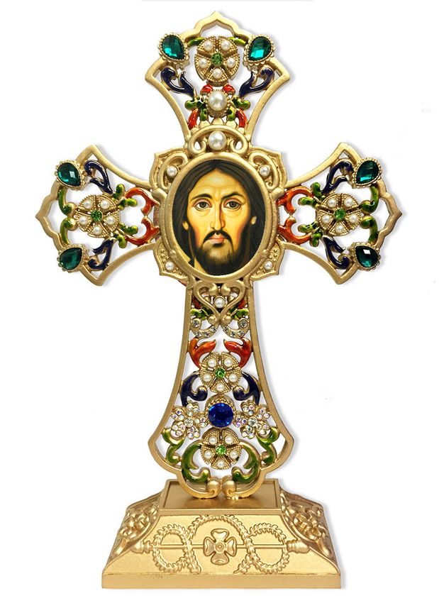 Christ of Sinai icon in filigree standing jeweled Icon cross, decorated with faux pearls