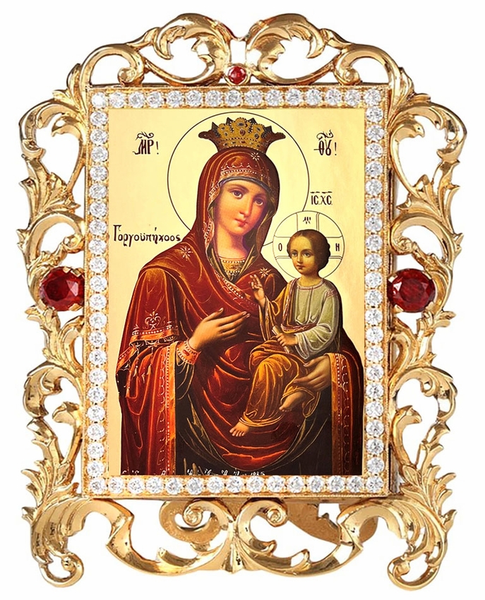 Virgin Mary Quick To Hear (Skoroposlushnitsa), Gold Foil Greek Byzantine Icon. Enameled jeweled framed ornament with its stand and chain.
