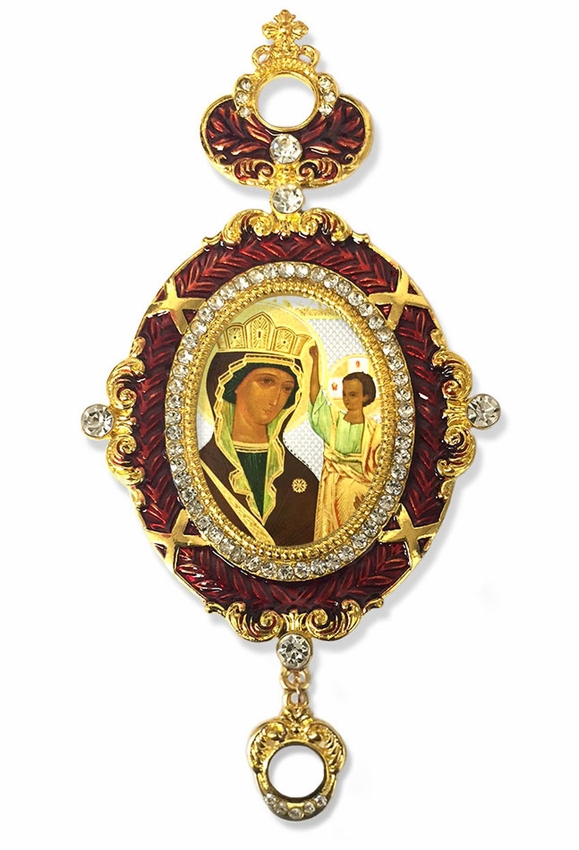 Enameled jeweled framed ornament with crown and chain for hanging.