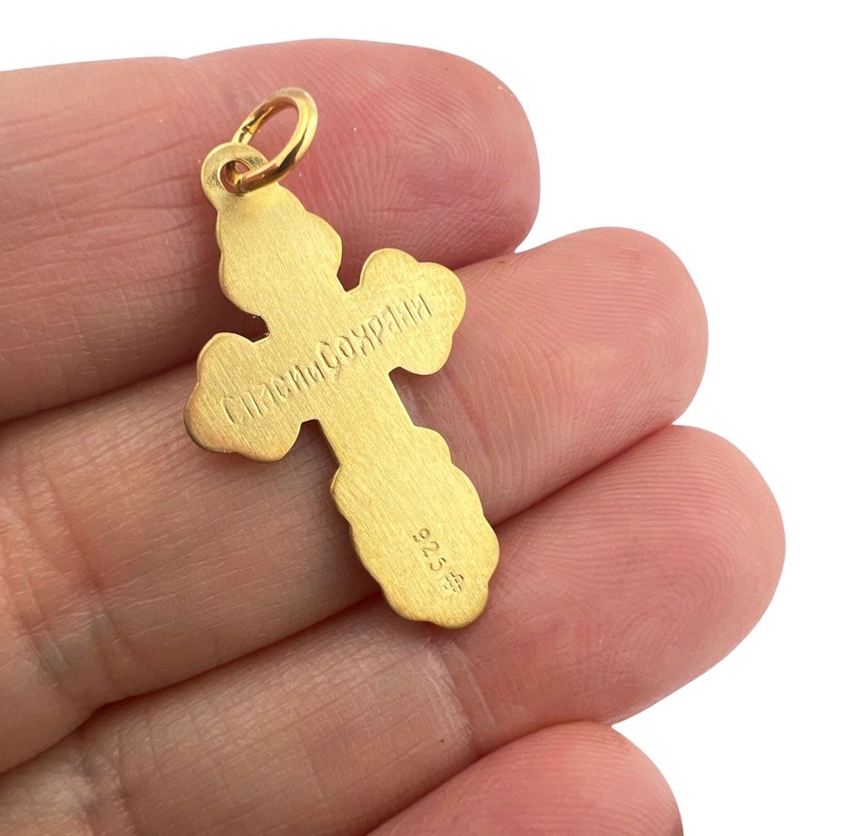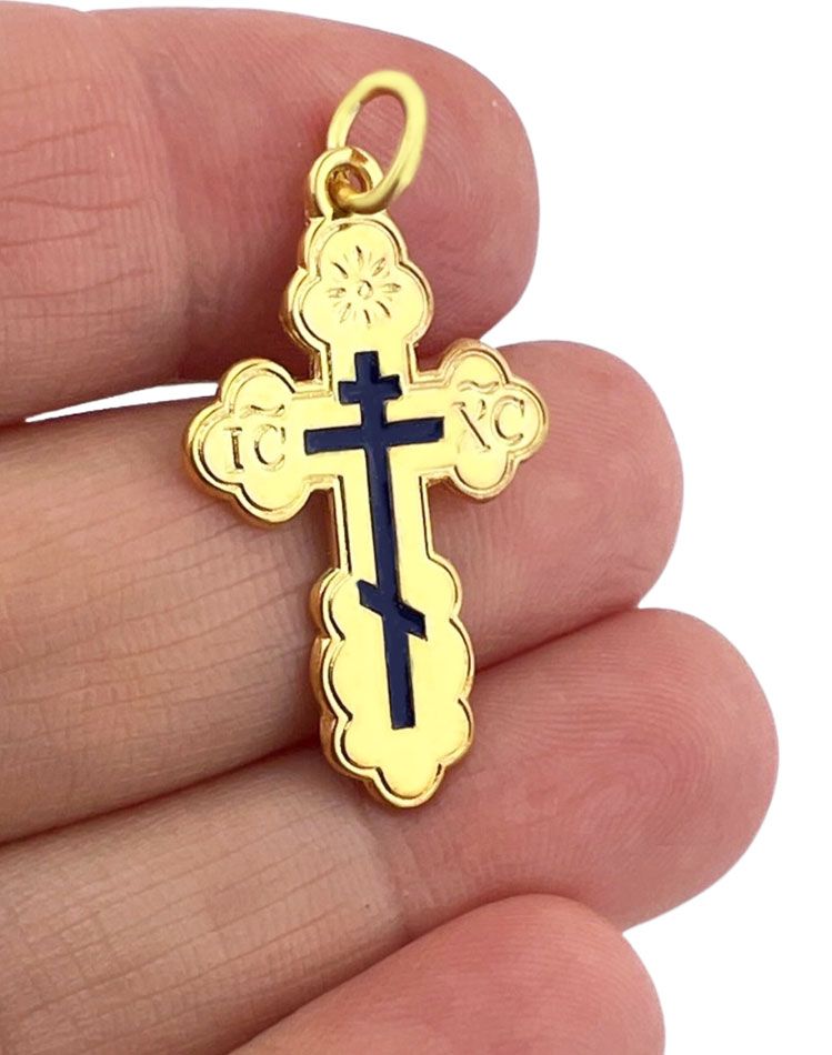 Pure Sterling Silver 925, with 24Kt Yellow Gold Electroplate, three Barred IC-XC Orthodox Cross with blue enamel.