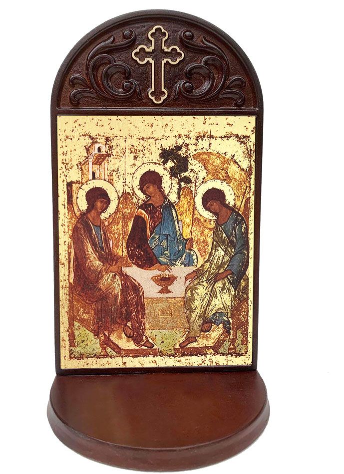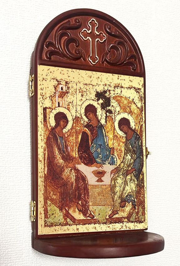 icon in wooden prayer shrine with 3" deep shelf to place rosary, candle etc..