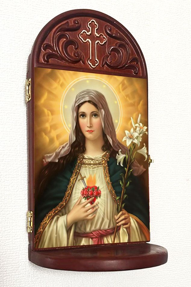 icon in wooden prayer shrine with 3" deep shelf to place rosary, candle etc..
