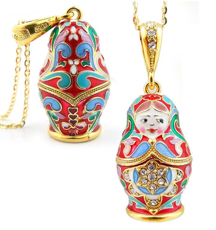Matreshka Doll Enamel Pendant, Silver 925, Gold Plated
