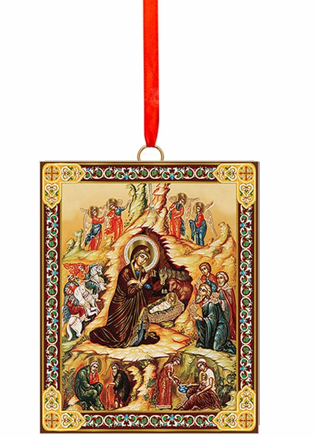 The Nativity, Wooden Icon Ornament w/Red Ribbon