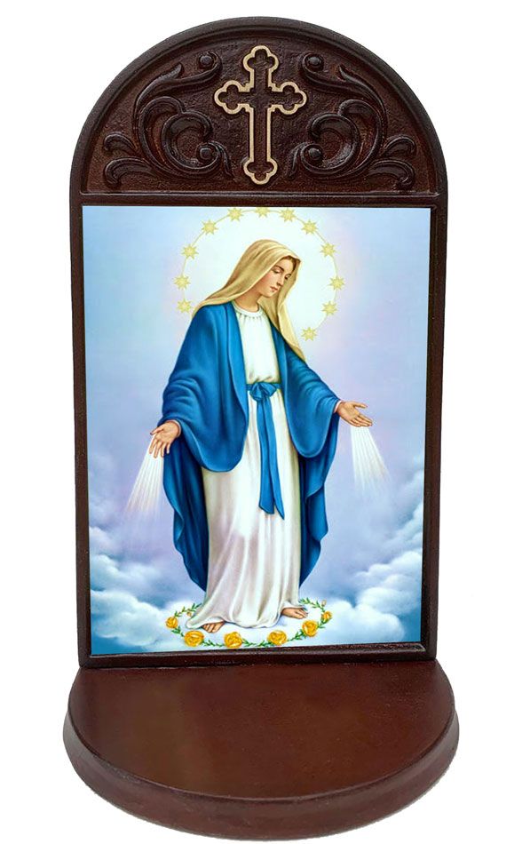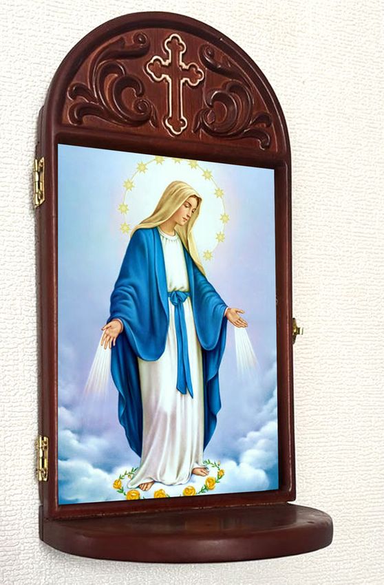 icon in wooden prayer shrine with 3" deep shelf to place rosary, candle etc..