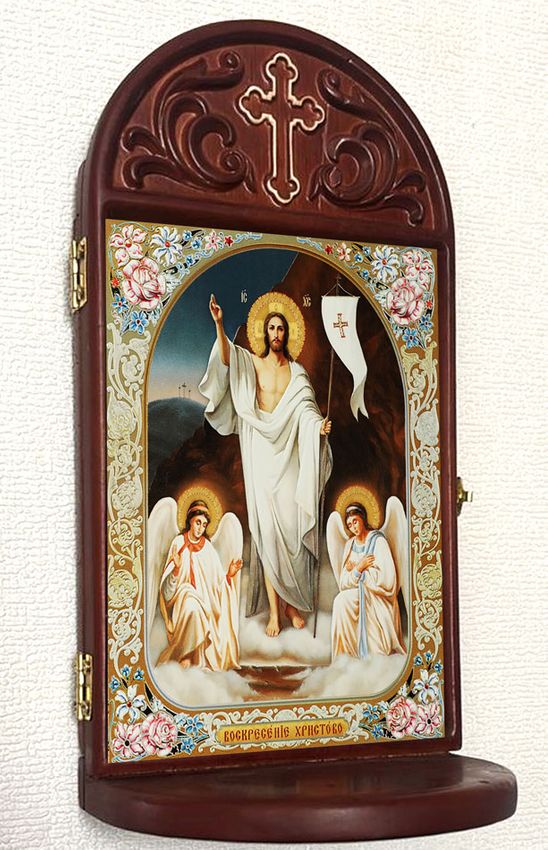icon in wooden prayer shrine with 3" deep shelf to place rosary, candle etc.