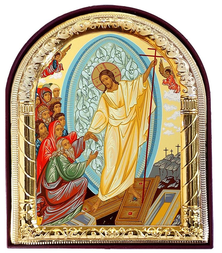 Resurrection of Christ, arched gold foil icon with stand and hole for hanging.