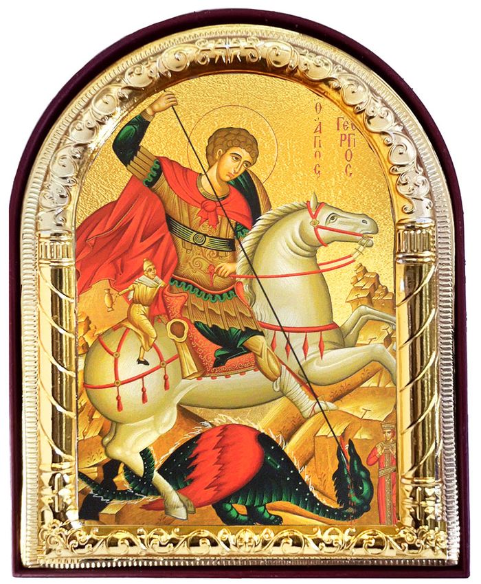 Saint George, arched gold foil icon with stand and hole for hanging.