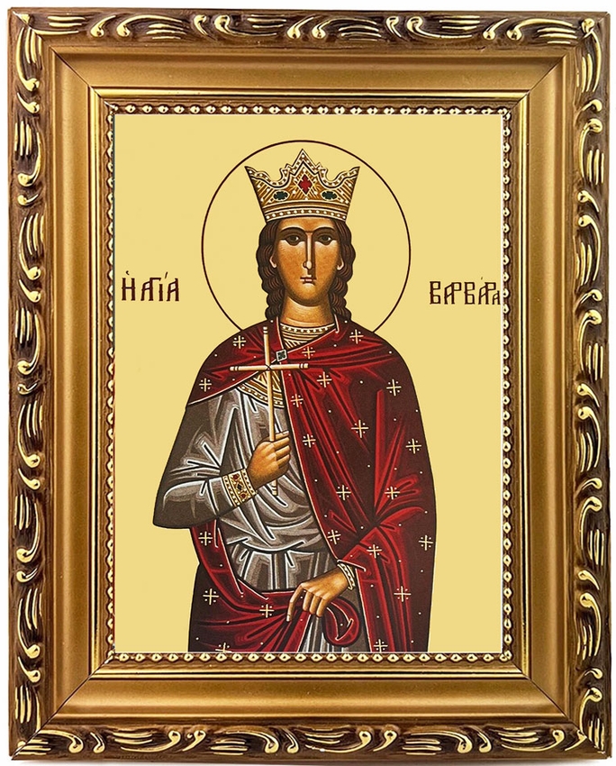 Saint Barbara The Great Martyr, wooden frame gold foil Greek Byzantine Icon with Its stand and hook for hanging on wall.