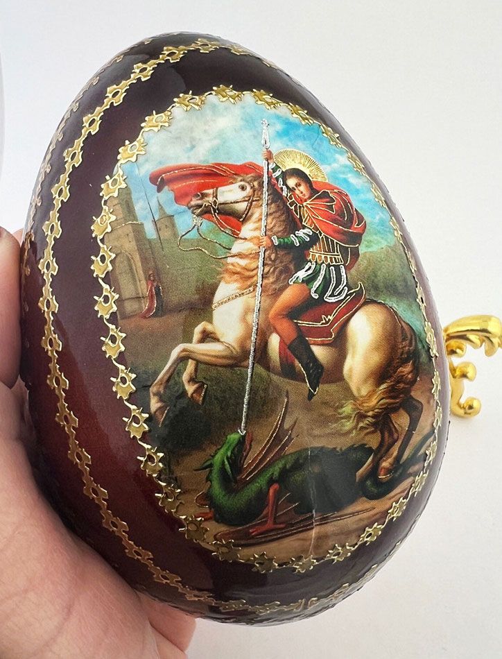 Saint George, wooden decoupage gold foil icon egg on gold tone metal stand holder