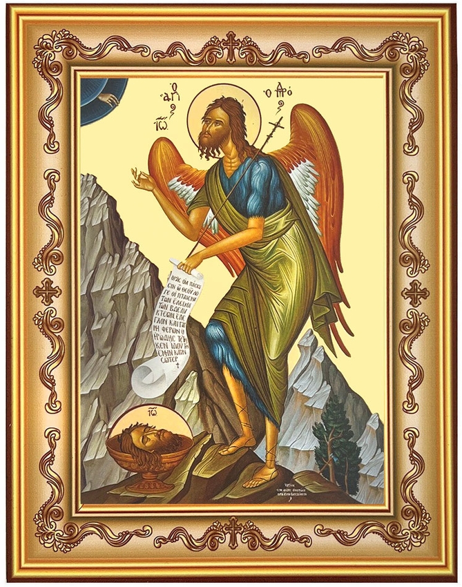 Saint John The Forerunner, Bird of Desert, wooden ornate frame gold foil Greek Byzantine Icon with its stand and hook for hanging on wall.