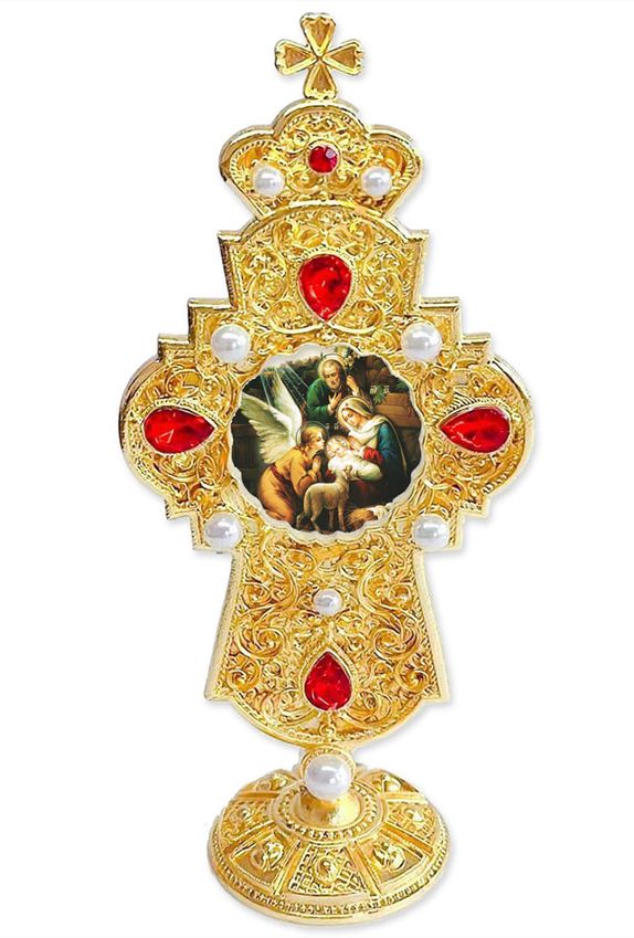 Nativity of Christ Adoration, Faberge style framed cross with Orthodox icon.