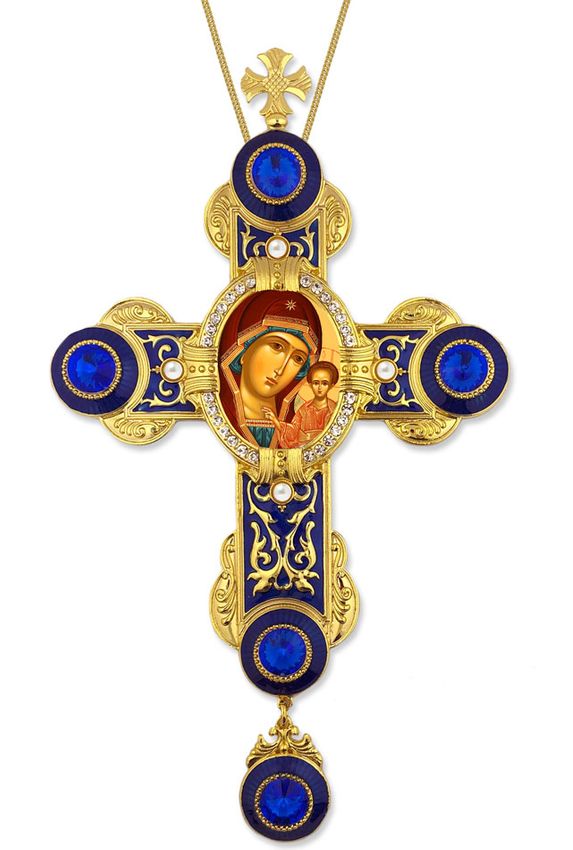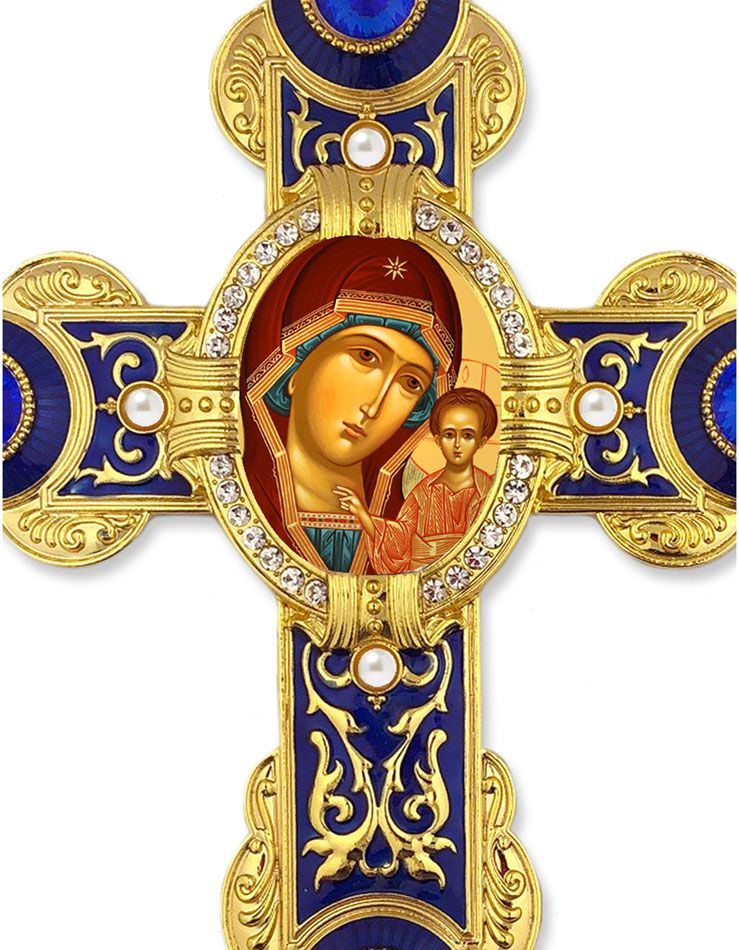 Virgin of Kazan Icon in Byzantine Styled Cross Ornament with blue crystals.