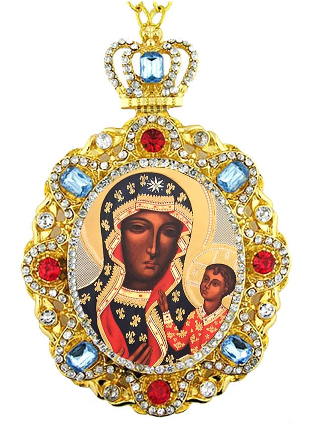 Virgin Mary Czestochowa (Black Madonna), jeweled faberge style icon pendant with detachable chain