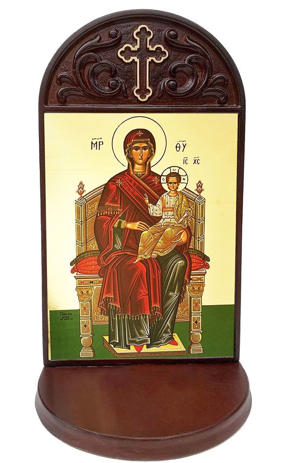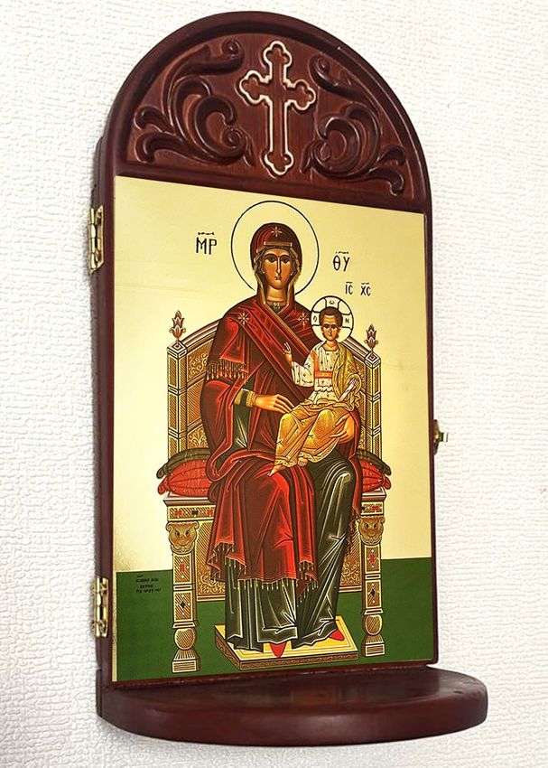 icon in wooden prayer shrine with 3" deep shelf to place rosary, candle etc..