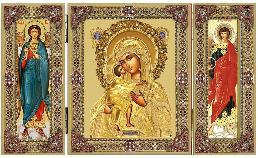 Virgin Mary Feodorovskaya,gold foil wooden icon triptych with Archangels Michael and Gabriel
