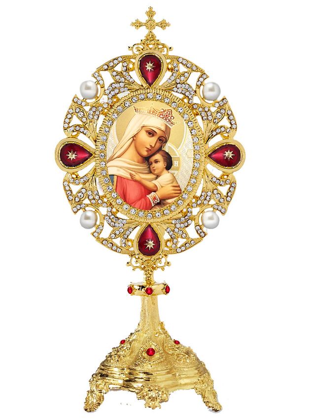 Virgin Mary Refuge of Hopeless (Sufferers), "Desperate One Hope" (Otchaiavshihsia Edinaia Nadezda), Icon in Pearl Jeweled Shrine. Rare Attractive Standing Monstrance - Reliquary Style Icon Shrine with the Cross makes a beautiful addition to your library, bedroom, or office.