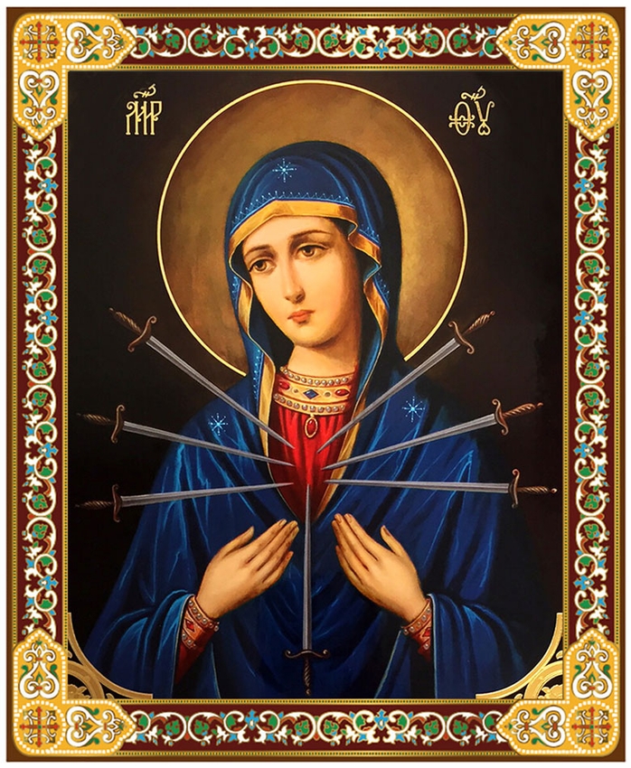 The Theotokos is depicted in this icon with her heart pierced by seven swords; a symbolic number possibly indicating the the fullness and boundless sorrow, pain and "sickness of heart" that would have been experienced by the