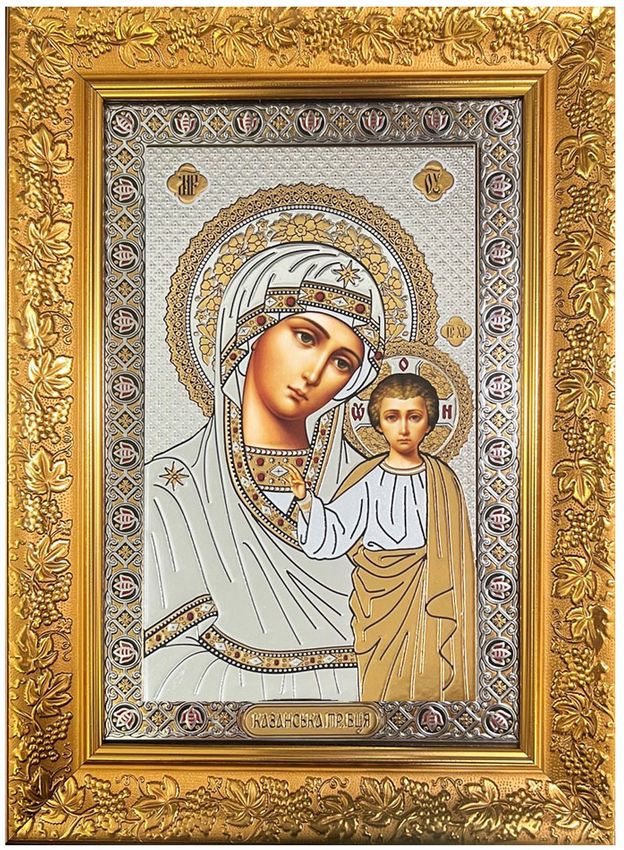 Virgin of Kazan, gold embossed framed orthodox icon covered with glass. Gold and silver foiled. Wall Hanging