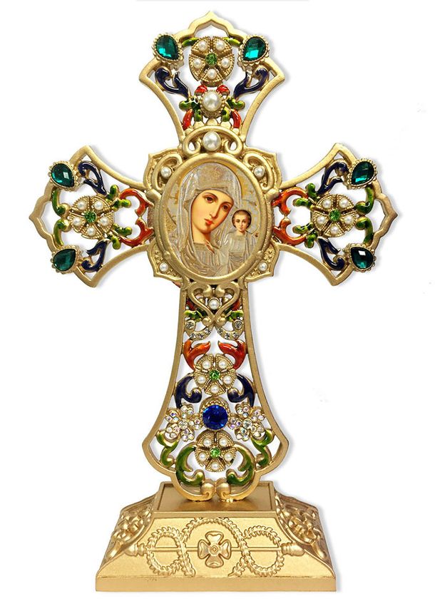Virgin of Kazan in Filigree Standing Jeweled Cross