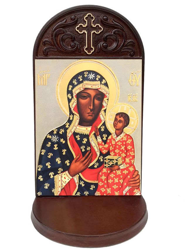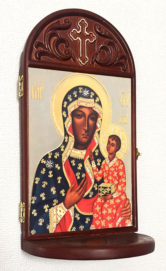icon in wooden prayer shrine with 3" deep shelf to place rosary, candle etc.