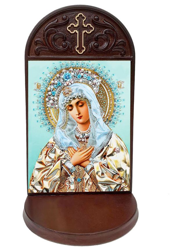 icon in wooden prayer shrine with 3" deep shelf to place rosary, candle etc..