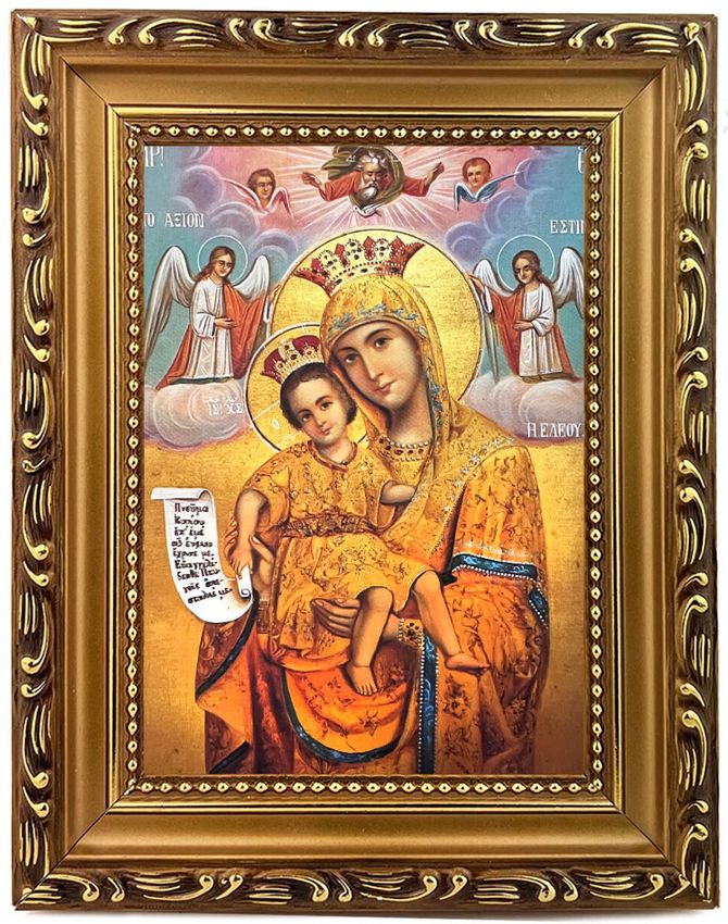 Virgin Mary "It Is Truly Meet" (DOSTOINO EST), wooden frame gold foil Greek Byzantine Icon with Its stand and hook for hanging on wall.