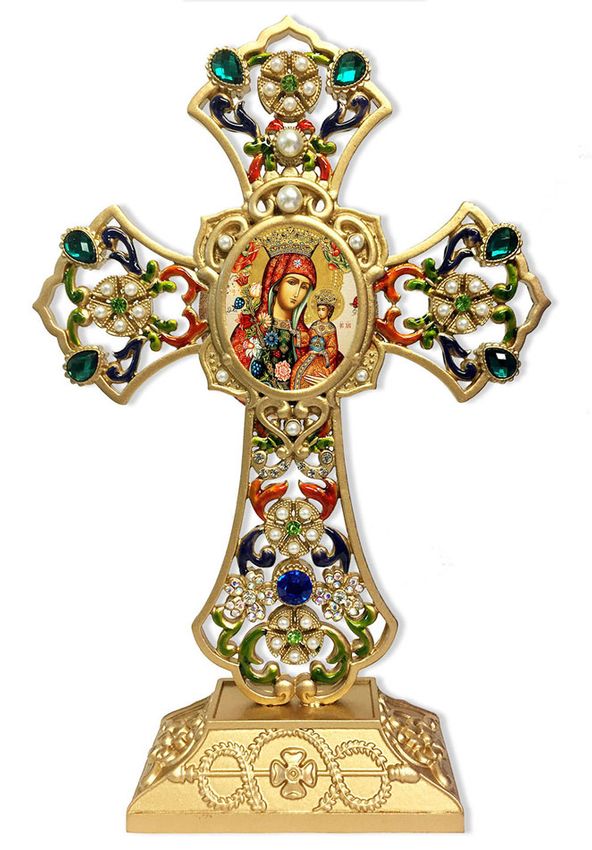 Virgin Mary Unfading Bloom icon in filigree standing jeweled Icon cross, decorated with faux pearls