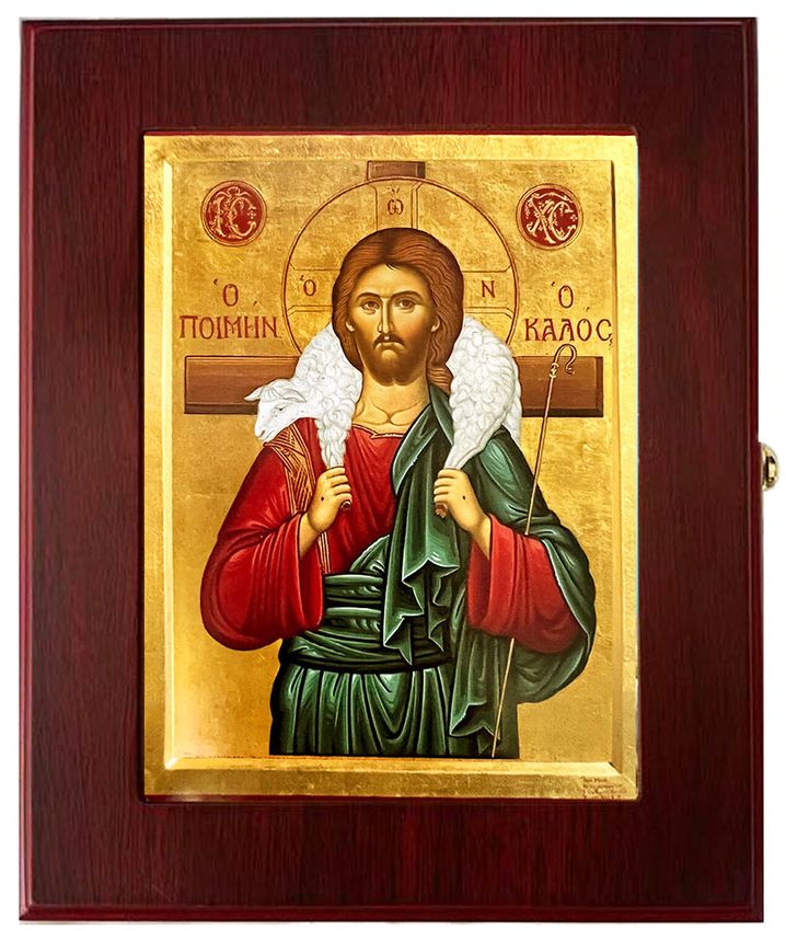 Wall Hanging framed wooden Icon Box featuring CHRIST, THE GOOD SHEPHERD Byzantine Greek icon.