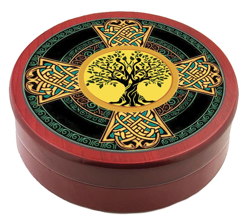 The Celtic Cross and Tree of Life, wooden icon keepsake round box, lined with red faux velvet. High quality.
